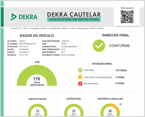 A vistoria Cautelar DEKRA é uma análise completa da identificação e estrutura do veículo. São aproximadamente 170 itens avaliados, que ainda tem a possibilidade do adicional com teste de pintura, onde também é verificado se o carro foi batido e o estado da pintura do veículo.